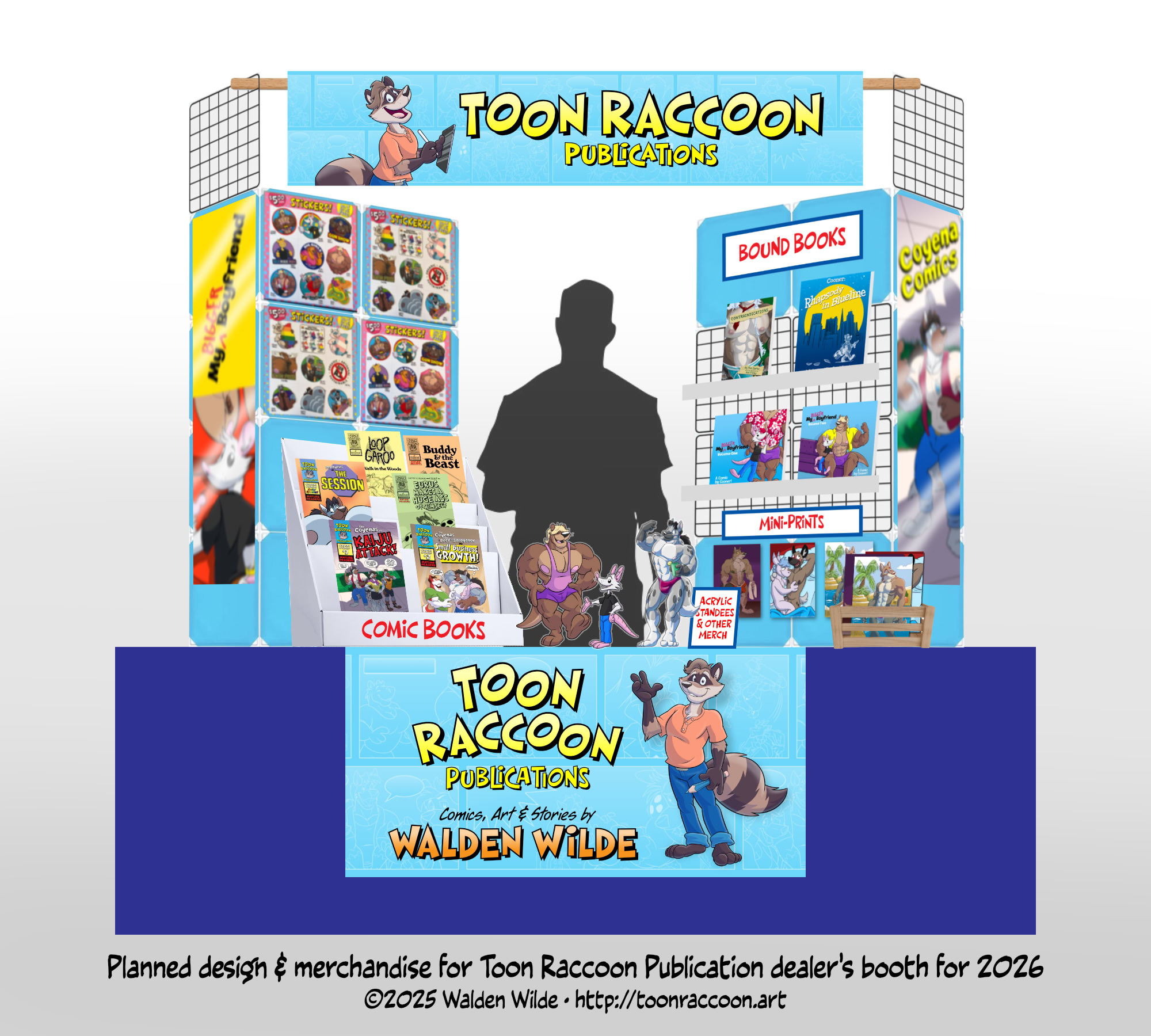 For 2026 I’ve been rebranding my event presence as Toon Raccoon Publications, with an emphasis on selling my own comic books and print stories, as well as merchandise related to those books: stickers, prints, and acrylic standees of popular characters. I’ll continue to offer laminated con badge pre-orders, as well as at-con sketch commissions for attendees, albeit in a more limited capacity.